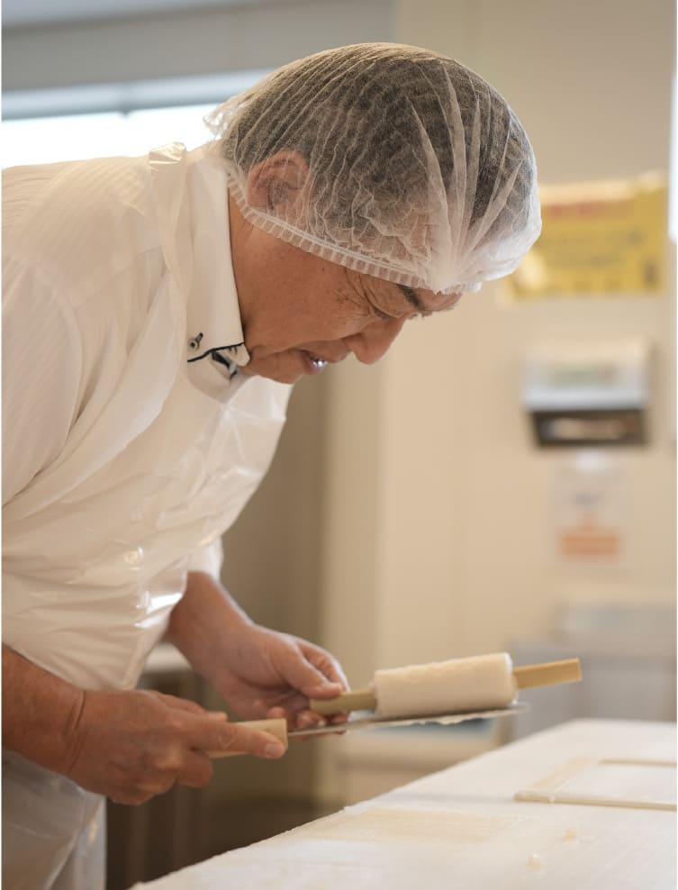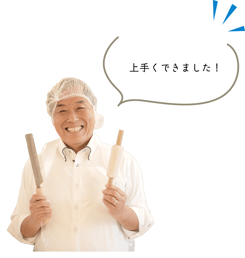 マネージャーの桂義明さんの案内でさっそくてっちゃん工房へ。食品づくりということで、ヘアネットを被ってエプロンを装着、しっかり手洗いを済ませる三上さん、実は手作り体験をするのは2回目なのだそう。「あのときはオープン前だったから12年ぶりかな…。簡単そうに見えてむずかしかった記憶があるので、今日は頑張ります」という三上さんに、「2回目ならもうベテランですよ!」と桂さん。三上さんはどんな練り物を作るのでしょうか。体験スタート!