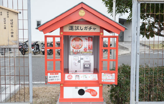 体験後は、敷地内にあるほぼカニ神社に参拝。本物そっくりの見た目と味が話題となり、2014年販売開始からカネテツの看板商品となった「ほぼシリーズ」。「本物のカニは高価で手が出ないというお客さまのお困りごとをもとに、より本物に近いカニカマを目指して商品開発したほぼカニは、お困りごとの解消という神社との親和性も高かった」ということで昨年4月に建立されました。由緒や参拝の作法が書かれた看板も社員の皆さんが一生懸命考えたもの、遊び心を忘れないカネテツの社風がうかがえます。おみくじ付きのカニ爪をモチーフにしたお守りが出てくるカプセルトイやてっちゃん工房が開いている日には御朱印もいただくことができます。