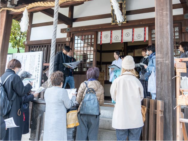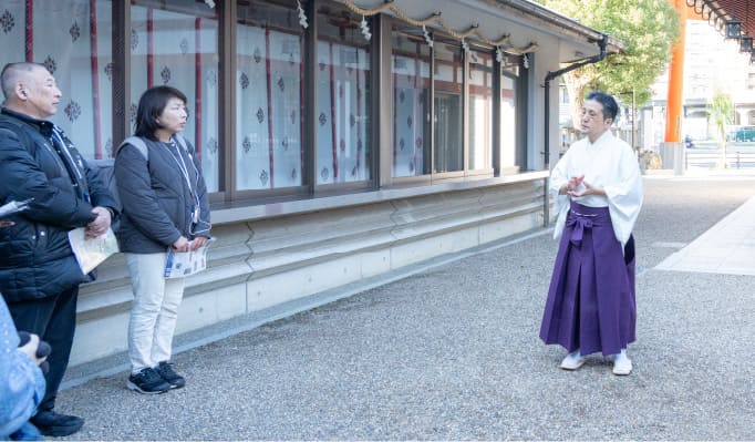 宮司から直接神社や周辺の歴史を聞くことができるのも今回のツアーの醍醐味。昭和20年の戦災による焼失に加えて、阪神・淡路大震災により、貴重な資料はほとんど失われてしまいましたが、灯籠や手水鉢などは江戸時代のものだそう。「毎年十日えびすにはお参りするけど、めちゃくちゃ賑やかで楽しい雰囲気と全然違う。改めてじっくり神社を見て回るのも楽しいです」とウラリエさん。境内を見学し、御朱印をいただいたら次のスポットへ。