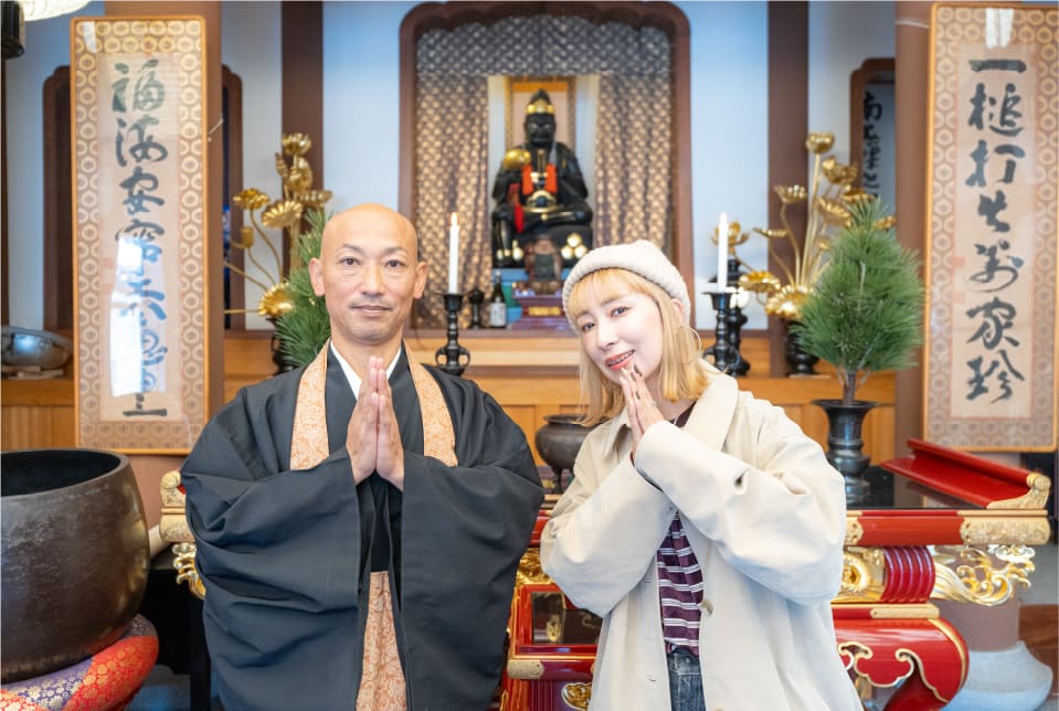 柳原蛭子神社の向かいにある福海寺は足利尊氏由来のお寺。由緒や歴史など、住職のお話を聞いた後は七福神・大黒天を祀る本堂で、15分間の座禅が体験できます。住職が回ってきたときに手を合わせれば、警策で肩を叩いてくれます。短い時間ですが、静寂の中で精神を統一させることで気分が晴れやかに。「座禅も初体験だったけど、いいですね。またやりたいな~」とウラリエさん。