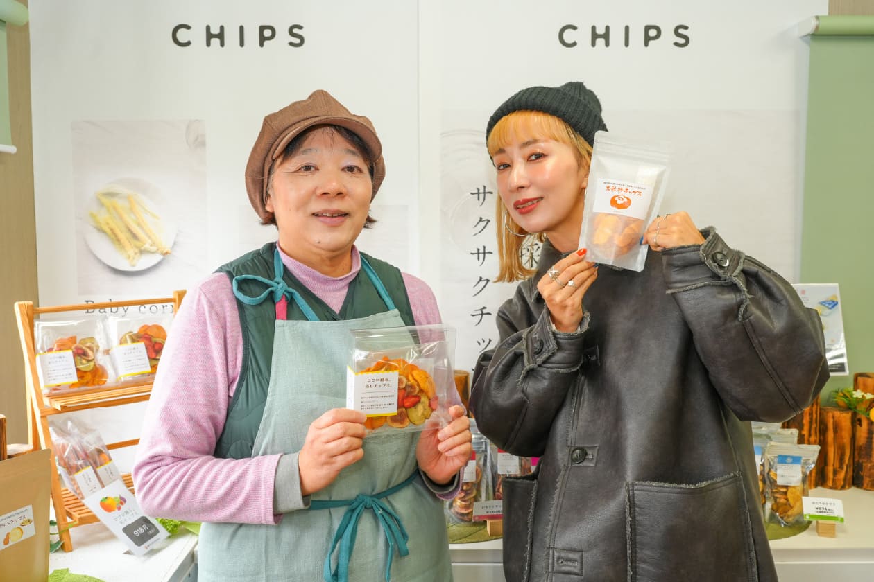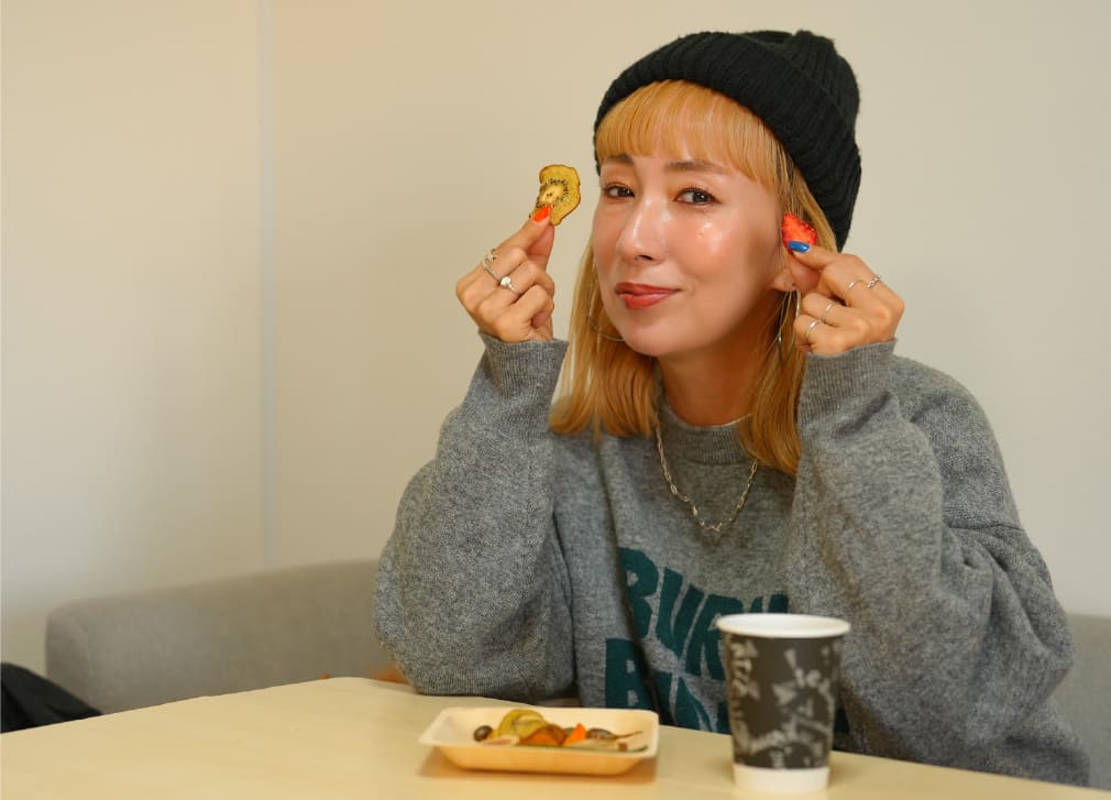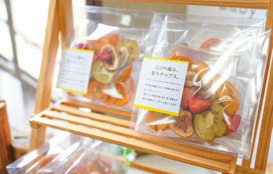 神戸咲く咲くHarmonyは自社農園の中にショップと体験施設と工場が併設。貸し切りレストランにも使える体験施設でまずはオリジナル商品のチップスをいただきます。丹波の黒豆、西区のジャガイモ、ニンジン、イチゴ、イチジク、柿、国産のホタテなどを真空フライヤーで乾燥。真空にすることで低温で揚げることができ、栄養価を損なうことなく、残油量も少ないため、素材のおいしさはそのままにサクサクの食感が絶妙なチップス。「やばい、いくらでも食べられちゃう」とウラリエさんもニコニコ。